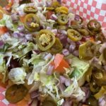 - Toppings include lettuce, tomato, mayo, mustard and ketchup along with chips and a dessert.